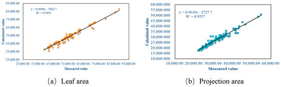 In this study, the calculation method presented in Section 2.5.1 of this paper was used to obtain the values of leaf area, projected area, and mean leaf inclination of tomato plants at the initial flowering, florescence, primary fruiting, and ripening stages, and compared with measured values. The correlation between the calculated and actual values are shown in Figure 18 and Figure 19.