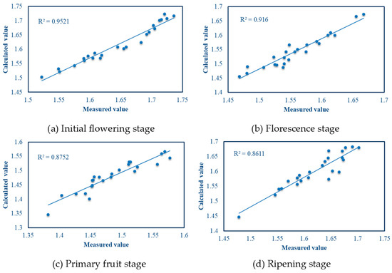 In this study, the light penetration depth calculation method proposed in Section 2.5.3 of this paper was used to calculate and obtain the values of light penetration depth for tomato plants at the initial flowering, florescence, primary fruiting, and ripening stages, and compared with the measured values. The correlation between the calculated and actual values is shown in Figure 22.