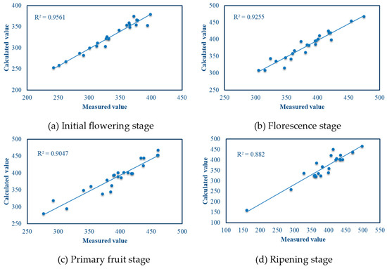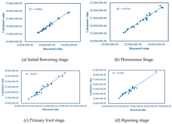 In this study, the plant height and digital biomass values of tomato plants were calculated at the initial flowering, florescence, primary fruiting, and ripening stages, and compared with the measured values. The correlation between the calculated and measured values is shown in Figure 20 and Figure 21.