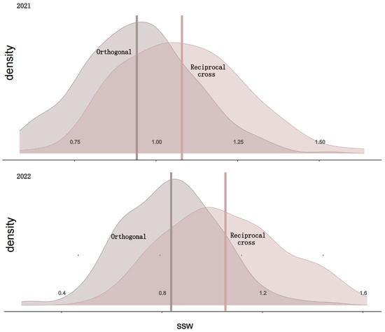 Distribution of SSW in orthogonal and reciprocal populations from 2021 to 2022.