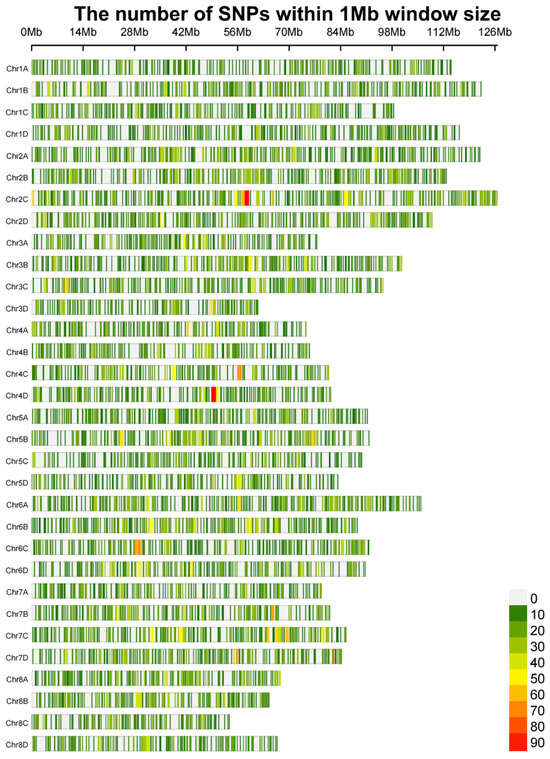 After conducting variant detection and rigorous filtering on the Hyper_seq_FD sequencing data of 409 sugarcane samples, a total of 31,204 high-quality SNPs were obtained. These SNPs were evenly distributed across all 32 chromosomes (Figure 2). This indicates that our Hyper_seq_FD dataset can effectively represent the variation distribution in sugarcane and the overall genomic variation of sugarcane, enabling accurate genotyping of the 409 sugarcane samples.