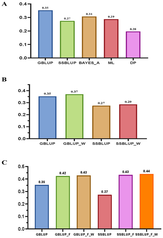 The genomic estimated breeding values (GEBVs) of all genotyped individuals were estimated using five methods. Predictions using Bayes A, machine learning (ML), and deep learning (DP) methods were conducted using the Smart Breeding Platform (https://sbp.ibreed.cn, accessed on 18 Ocotober 2024) [22]. The calculation of GRM and predictions using GBLUP and SSBLUP methods were completed using the BLUPF90 [23] series of tools. The prediction accuracy (r) is the average of five repetitions of N-fold cross-validation. In each repetition, the samples were randomly arranged and divided into N parts, with N-1 parts used as training data and the remaining part as test data in rotation, and the correlation between the true and predicted values was calculated: GBLUP_W: GBLUP with weights assigned to SNPs based on their genomic regions. GBLUP_F: GBLUP incorporating fixed effects for crosses (orthogonal and reciprocal populations). GBLUP_F_W: GBLUP with both weighted SNPs and fixed effects for crosses. SSBLUP_W: SSBLUP with weights assigned to SNPs based on their genomic regions. SSBLUP_F: SSBLUP incorporating fixed effects for crosses (orthogonal and reciprocal populations). SSBLUP_W: SSBLUP with weights assigned to SNPs based on their genomic regions.