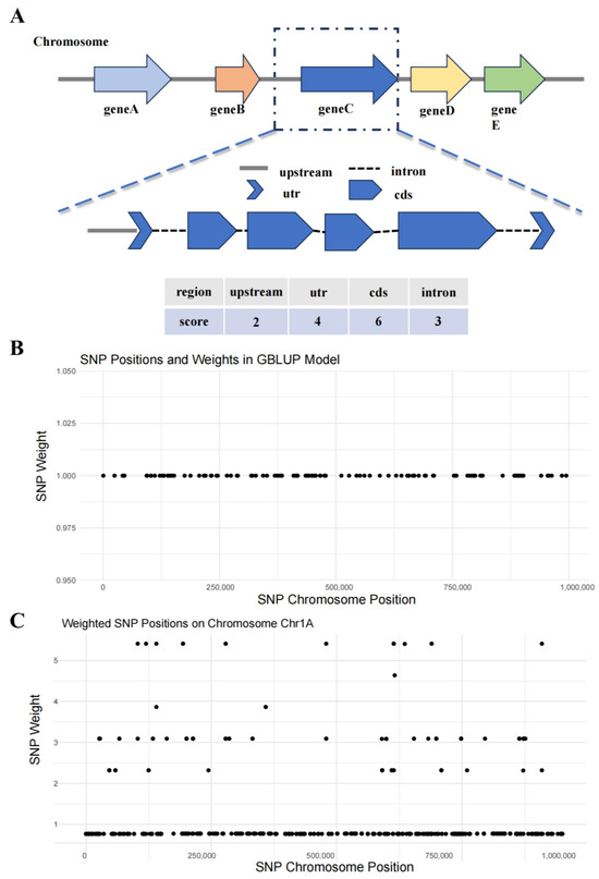Schematic diagram of sugarcane genome scoring and weighting. (A) Schematic representation of sugarcane gene structure scoring. (B) Schematic diagram of SNP weights in the traditional GBLUP model. (C) Schematic diagram of SNP weight after scoring.