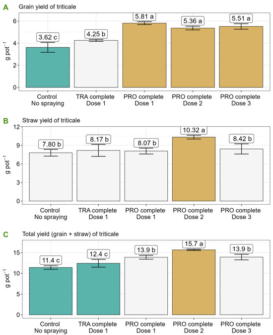 Triticale yield: (A) grain yield, (B) straw yield, and (C) total yield. Different lowercase letters indicate significant differences according to the Tukey’s test (p < 0.05). The vertical bars indicate the standard deviation of the mean.