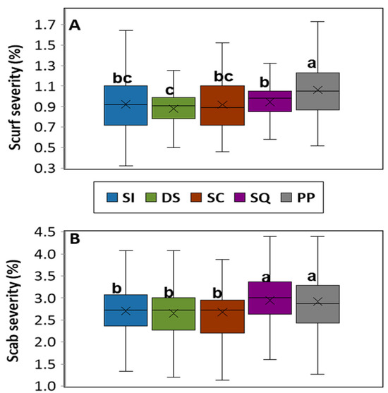 | Incidence (% Infected Tubers) | Severity (% Surface Coverage) | |||||||