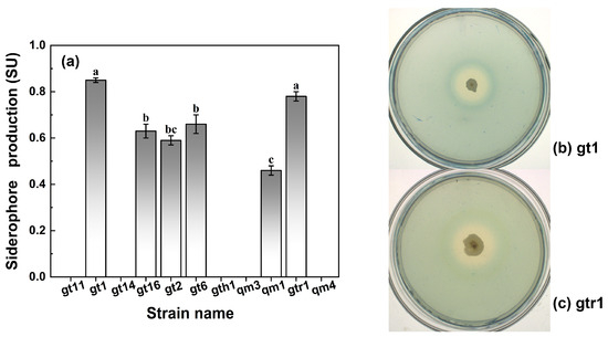 The siderophore-producing characteristics of the PGPR strains: (a) Siderophore production of different test PGPR strains; different lowercase letters (a–c) indicate significant differences (p < 0.05) among the treatments. (b,c) An orange-yellow halo was detected on the edge of the colony on the blue CAS detection plate with the test PGPR strains (partial).