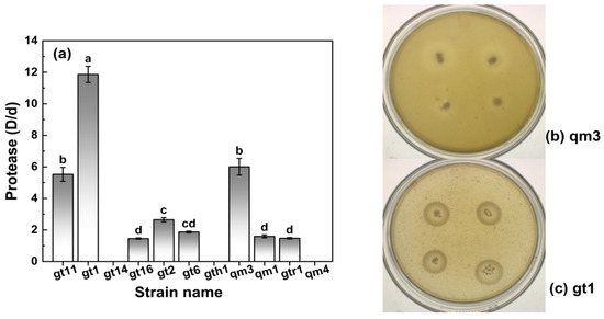 The protease-producing ability of the PGPR strains: (a) Protease production of different test PGPR strains; different lowercase letters (a–d) indicate significant differences (p < 0.05) among the treatments. (b,c) Transparent zones on the protease detection medium plate with the test PGPR strains (partial).