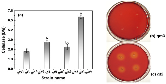 The cellulase-producing characteristics of the PGPR strains: (a) Cellulase production of different test PGPR strains; different lowercase letters (a–c) indicate significant differences (p < 0.05) among the treatments. (b,c) Transparent zones on the cellulase detection medium plates with the test PGPR strains (partial).