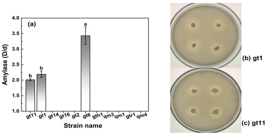 The amylase-producing characteristics of the PGPR strains: (a) Amylase production of different test PGPR strains; different lowercase letters (a,b) indicate significant differences (p < 0.05) among the treatments. (b,c) Transparent zones on amylase detection medium plates with the test PGPR strains (partial).
