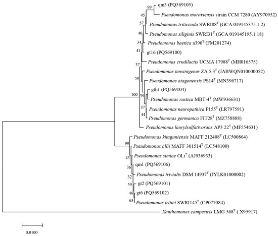 Phylogenetic tree constructed using the neighbor-joining method, based on the 16S rRNA gene sequences showing the phylogenetic positions of PGPR strains gth1, gt16, qm3, gt6, gt2, and qm1 relative to the defined species of the genus Pseudomonas. Bootstrap values of more than 30% for 1000 replicates of the dataset are provided on the branches. Bar = 0.01 substitutions per nucleotide position.