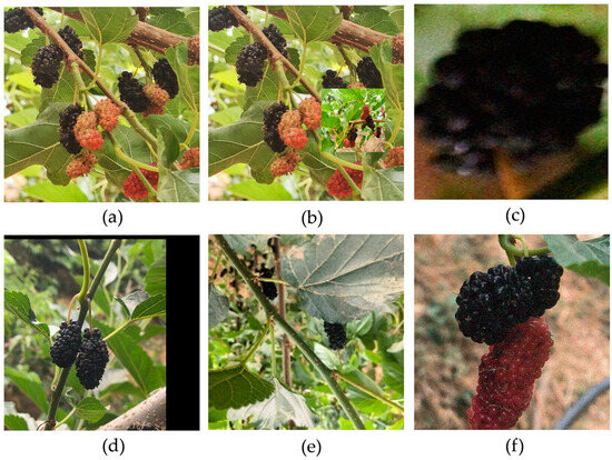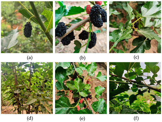 Example of mulberry fruit collection image: (a) simple target; (b) multiple target; (c) light occlusion; (d) heavy occlusion; (e) fairing; (f) backlighting.