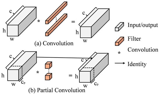 The floating point operations (FLOPs) of PConv are calculated as shown in Equation (1). In this equation, and represent the height and width of the input feature map, respectively; is the size of the convolution kernel; c represents the number of channels; and represents the number of channel divisions. The formula calculates the number of floating point operations required for performing a partial convolution on the input data.