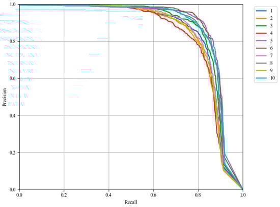 As a result, the training for distillation was extended to 300 epochs to allow the student model to better learn and absorb the features and knowledge from the teacher model. By adding 100 additional epochs, the student model showed a significant performance improvement after fully learning from the teacher model. The comparison of the Precision–Recall (PR) curves of different improved models is shown in Figure 9.