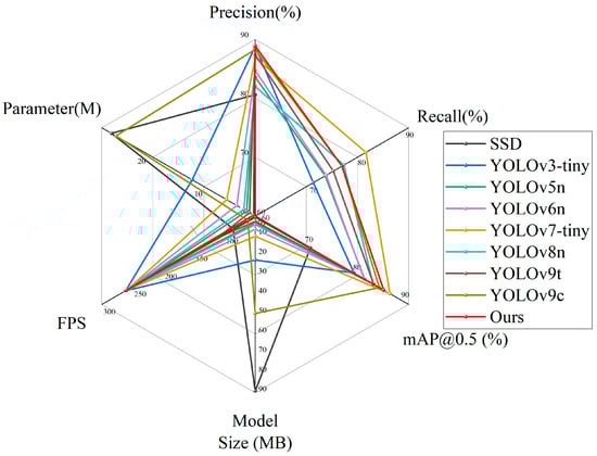 Figure 10 is a radar chart comparing the performance metrics of our model and the other models. As can be seen from the figure, the YOLOv7-tiny model achieves the highest recall and mAP, while our model exhibits the highest precision. In addition, our model has the smallest number of parameters and the smallest model. Most of the models have an FPS of around 260, with YOLOv3-tiny leading with 261 FPS and our model following with 260 FPS.
