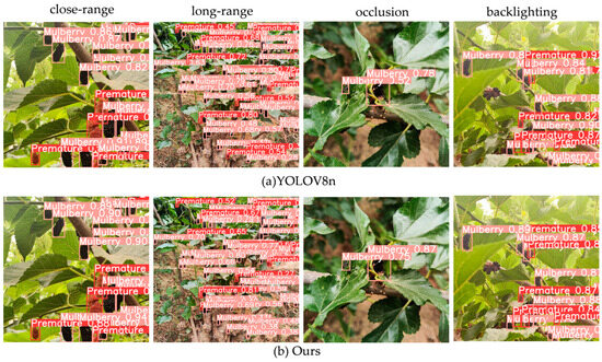 Experiment 7 combines the ADown and P-Head modules, combining the advantages of the two modules to improve the efficiency and precision of downsampling. The ADown module effectively reduces the loss of fine-grained information by improving the downsampling process, thus enhancing the model’s ability to extract multi-scale features, while the P-Head module optimizes the structure of the detection head to improve the inference speed and frame rate of the model. This combination aids the model not only to maintain a high precision and recall rate when dealing with the task of mulberry detection in complex backgrounds but also to significantly reduce the computational volume, achieving a good balance between precision and efficiency.