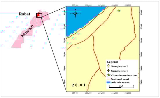 This research was conducted at the Regional Center of Rabat of the National Institute for Agricultural Research (INRA), within the Research Unit of Environment and Conservation of Natural Resources (URECRN). The experiment site is located at a latitude of 34°03′50″ N and a longitude of 06°50′40″ W, at an elevation of approximately 70 m above sea level, typical of Rabat’s coastal region in Morocco, which is characterized by a Mediterranean climate with oceanic nuances. The trial was carried out in a greenhouse at this center. The soils used in this study were sampled from the Temara region, 30 km south of Rabat, which is characterized by a Mediterranean climate with oceanic nuances. Figure 1 illustrates both the soil sampling sites and the experiment site. Average temperatures in the region range from 12 °C in winter to 28 °C in summer, with an average annual precipitation of 400 mm. Two soil types, a clayey soil and a sandy soil, were collected from local farms. This region was selected due to the high quality of its fine granulometric classes, which are particularly vulnerable to salinization. Soil samples were collected from the top 40 cm of the surface using an auger, as this layer is the most active and sensitive to erosion and irrigation-induced degradation. Additionally, a composite sample for each soil type was taken from the 0–20 cm depth in situ and transported to the soil and water chemistry laboratory of URECRN, INRA, Rabat, for the analysis of texture and the initial physicochemical composition before the start of the experiment (Figure 1).