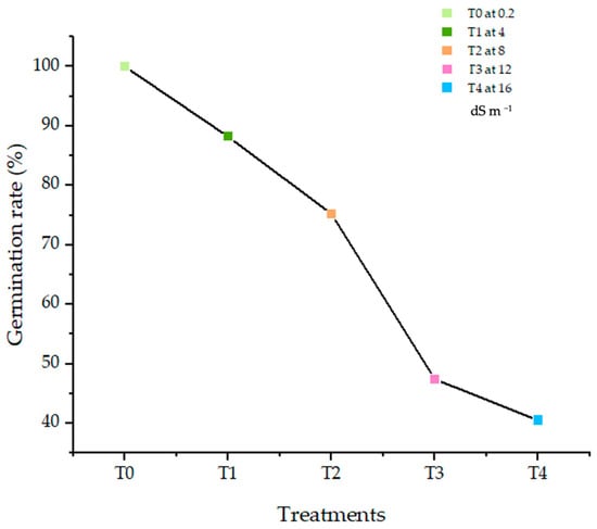 The results show a progressive decrease in the germination percentage of durum wheat seeds with increasing salinity levels (Figure 2): 98.7% at a salinity level of T0 (freshwater), and to 88.2, 75.2, 47.4, and 40.5% at 4, 8, 12, and 16 dS m−1, respectively. At 4 dS m−1, germination decreased slightly by 10.5% compared with the control, indicating moderate tolerance. At 8 dS m−1, although the reduction was more marked at 23.5%, the variety still appeared tolerant, with over 75% of seeds germinating, showing a notable ability to withstand salt stress. However, at higher salinity levels of 12 and 16 dS m−1, the decreases were significant, with reductions of 52% and 59%, respectively, showing that these salinity levels are highly stressful for the variety tested. These results suggest that the Faraj wheat variety tested has some salt tolerance up to 8 dS m−1, but shows increased sensitivity at higher salinity levels.