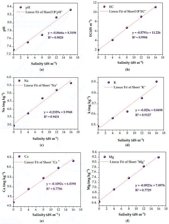 Relationship between various soil chemical parameters and different salinity levels in S1 soil: (a) pH; (b) electrical conductivity; (c) sodium; (d) potassium; (e) calcium; and (f) magnesium.