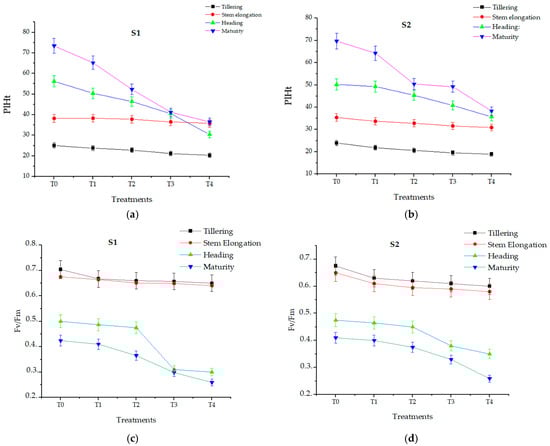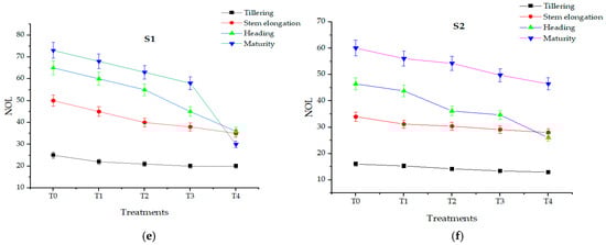 The increased intensity of salt stress at different growth stages leads to a progressive decrease in plant height at S1 and S2 (Figure 4). The tallest plant heights were observed in the control plants at T0, measuring 25.00 ± 0.02 cm at the booting stage and reaching a maximum average value of 73 ± 0.04 cm at the maturation stage for S1. In contrast, for S2, heights at T0 ranged from 23.00 ± 0.09 cm at the booting stage to a maximum of 69.00 ± 0.07 cm at the maturation stage. Despite applying increasing doses of NaCl, a slight stability in height was observed at the booting and stem elongation stages compared to the control. Heights at high salinity (16 dS m−1) were 20.00 ± 0.03 cm and 35.00 ± 0.08 cm, respectively, for S1. However, a decline in height growth was observed at the heading and maturation stages, recording heights of up to 36.00 ± 0.05 cm and 30.00 ± 0.04 cm at a salinity level of 16 dS m−1 for S1.