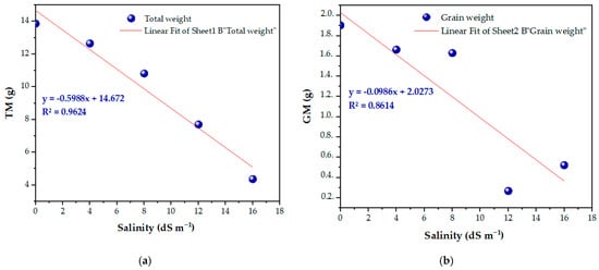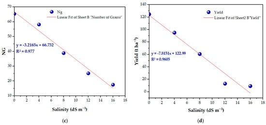 According to the regression graphs (Figure 5), negative correlations were identified between salinity and all yield components.