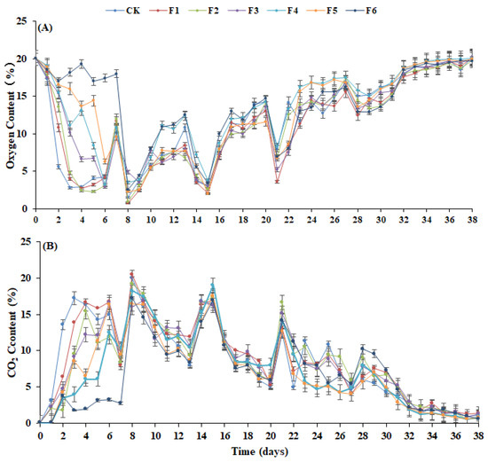 Variations in (A) oxygen and (B) carbon dioxide during the composting.
