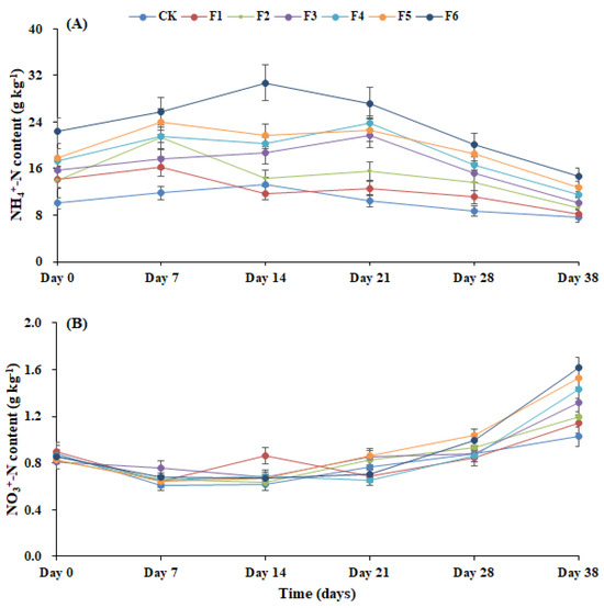 The results indicated that NH4+N and NO3−N contents were improved with the increase in the dose of FeSO4 (Figure 5). The NH4+N contents were improved with the application of FeSO4, indicating that FeSO4 has the capability to retain N contents in the compost. A similar trend was shown in all treatment groups, where NH4+N contents were lowest on the first day and then increased until midday (Figure 5A). This might be due to the mineralization of organic N with a high temperature and pH that favors microbial activity. Later, NH4+N contents decreased gradually by the end of composting. This decline could be associated with nitrobacteria that transform NH4+N to NO3−N [44], whereas the end composting product has the highest NH4+N contents with F6 due to its highest level of FeSO4 (Figure 5A). Similarly, the NO3−N contents were also improved with the increase in FeSO4. The NO3−N contents decreased gradually followed by the highest value until the end of the composting, possibly due to the high temperature and pH inhibiting the growth of nitrifying bacteria. Afterward, the decrease in temperature enhanced the NO3−N contents in the compost [44]. The treatment group comparison revealed that NO3−N contents increase with the increase in the dose of FeSO4 (Figure 5B).