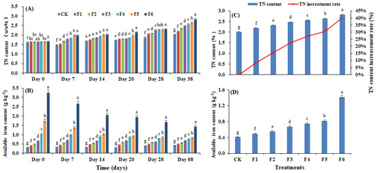 Total N contents were also enhanced with the application of FeSO4 (Figure 6A). All the treatments showed similar total N contents at the beginning of the composting. Later, the total N contents increased gradually reaching their maximum at the end of the experiment (day 68). The F6 treatment showed the highest value (2.83 w/w%), whereas CK showed the lowest value (2.02 w/w%), indicating that increasing FeSO4 levels also ensure that emissions are minimized and N contents are retained in composting material. Furthermore, available Fe contents were also improved with the increase in FeSO4 levels. CK, F1, and F2 treatments showed a similar pattern of Fe increments with time, whereas the F3 treatment showed almost similar values at the beginning (6.86 g kg−1) and at the end (6.71 g kg−1) of the experiment. Contrarily, F4, F5, and F6 reduced the Fe content in compost at day 68 compared to the starting day of the composting (Figure 6B). The total N increment rate was also high with the application of FeSO4. The F6 treatment group showed the highest value (40.03%), followed by F5 (30.49%), F4 (27.23%), F3 (22.42%), F2 (15.46%), and F1 (8.36%), respectively (Figure 6C). The total available Fe content in the compost was highest with the F6 treatment (14.23 g kg−1), followed by F5 (8.16 g kg−1), F4 (7.51 g kg−1), F3 (6.71 g kg−1), F2 (5.57 g kg−1), F1 (4.91 g kg−1), and CK (4.09 g kg−1), respectively (Figure 6D).