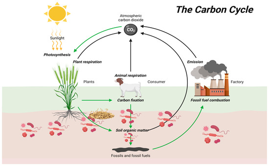 Carbon Dynamics in Soil. Plant or animal residues accumulation on soil leads to organic matter buildup. These organic materials are degraded by microbial decomposers that fix carbon in the soil and form humus. Soil organic carbon is used by other microbial communities to support metabolic activities in the soil living system. Created by author, in BioRender. Khan, M. (2024) https://BioRender.com/m23a751 (accessed on 28 November 2024).