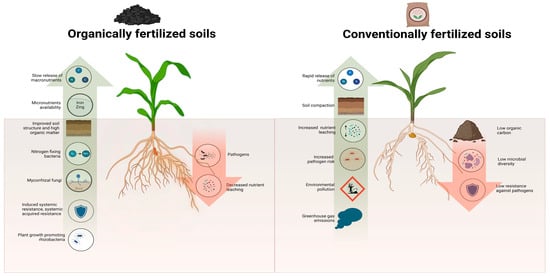 Comparison of organic and conventional fertilizers for soil fertilization. Organic fertilizers provide a sustainable and steady supply of nutrients. Moreover, they offer gradual but sustainable soil health improvement that exhibits resilience against extreme climatic events. Conventional fertilizers, on the other hand, result in nutrient leaching and degrade soil quality over time. Created by author, in BioRender. Khan, M. (2024) https://BioRender.com/m23a751 (accessed on 28 November 2024).