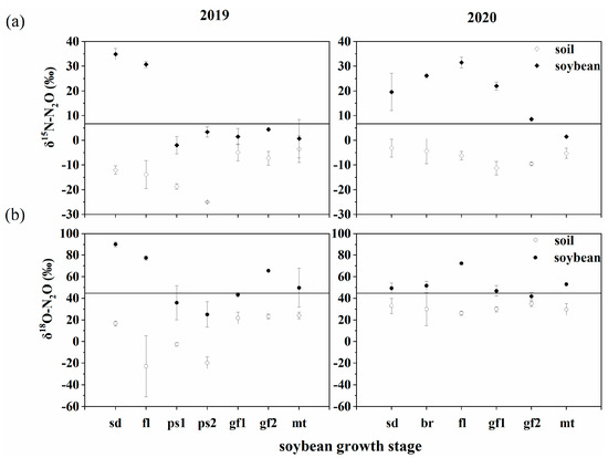 Isotopic signature of 15N (a) and 18O (b) in N2O emitted from soybean plant (solid diamonds and circles) and from soil (open diamonds and circles) during two growing seasons. The horizontal lines presented the atmospheric levels of δ15N- and δ18O-N2O.