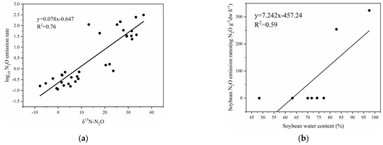 (a) Correlation between the logarithm of N2O emission from soybean plant and their δ15N-N2O values (n = 34). (b) Correlation between the N2O emission rates from soybean plant and their water contents (n = 8).