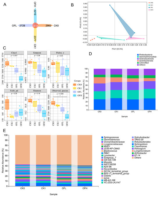 Subsequently, the α-diversity indices for the CK0, CK1, OFL and OFH groups were determined, encompassing metrics such as Chao1, Simpson, Pielou’s evenness, Faith’s PD, Shannon, and observed species values. The analysis revealed no significant disparities in the Chao1, Simpson, Pielou’s evenness, Faith’s PD, and Shannon among the CK0, CK1, OFL, and OFH groups (p > 0.05). However, the observed species count in the OFH group was significantly lower than that in the CK0 group (p = 0.049 < 0.05, Figure 2C). These findings indicate that the application of higher rates of alternative bioorganic fertilizers (3150 kg ha−1) could lead to a notable decrease in species richness within the rhizosphere soil of potatoes, while not impacting the other α-diversity indices such as Chao1, Simpson, Pielou’s evenness, Faith’s PD, or Shannon.