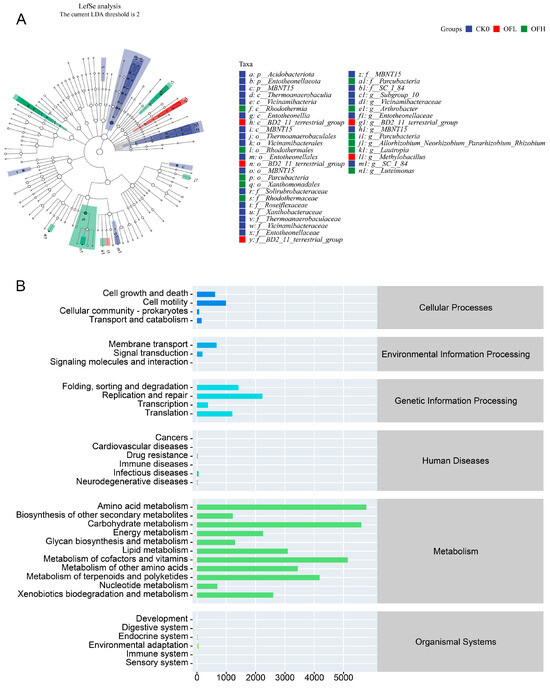 LEfSe analysis employed to identify biomarkers across various groups and taxonomic levels. At the phylum level, Acidobacteriota, Entotheonellaeota, and MBNT15 were specific to the CK0 group (Figure 3A). Delving into the genus level, Subgroup-10, Vicinamibacteraceae, Entotheonellaceae, MBNT15, and SC-I-84 emerged as the defining bacterial communities characteristic of the CK0 group. In contrast, the OFL group was notably marked by the presence of BD2-11-terrestrial-group and Methylobacillus as key genera. Meanwhile, the OFH group was distinguished by significant genera such as Arthrobacter, Parcubacteria, Lautropia, Luteimonas, and Allorhizobium-Neorhizobium-Parahizobium-Rhizobium (Figure 3A).
