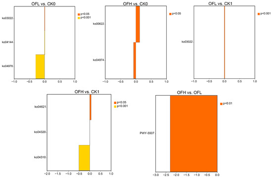 The differential pathways in the comparison groups of OFL vs. CK0, OFH vs. CK0, OFL vs. CK1, OFH vs. CK1, and OFH vs. OFL using the metagenomeSeq method. CK0: without chemical nitrogen fertilizer and organic fertilizer; CK1: single application of chemical nitrogen fertilizer with optimal nitrogen application; OFL: 70% chemical nitrogen fertilizer combined with 30% bioorganic fertilizer nitrogen; OFH: 30% chemical nitrogen fertilizer combined with 70% bioorganic fertilizer nitrogen.