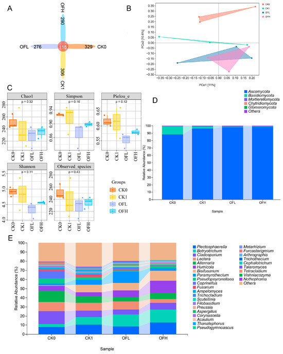 Effects of different fertilizing methods on the overall composition of soil fungal communities through internal transcribed spacer (ITS) sequencing. (A) The Venn diagram of the annotated soil fungal communities (ASVs) in the different groups. (B) The principal coordinate analysis of the samples in the different groups. (C) The α-diversity of the soil fungal communities. including Chao1, Simpson, Pielou’s evenness, Shannon, and observed species values in the different groups. (D) The distribution of top5 dominant phyla of soil fungal communities in the different groups. (E) The distribution of top30 dominant genera of soil fungal communities in the different groups. CK0: without chemical nitrogen fertilizer and organic fertilizer; CK1: single application of chemical nitrogen fertilizer with optimal nitrogen application; OFL: 70% chemical nitrogen fertilizer combined with 30% bioorganic fertilizer nitrogen; OFH: 30% chemical nitrogen fertilizer combined with 70% bioorganic fertilizer nitrogen.