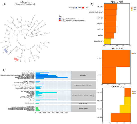 Identification of the soil fungal biomarkers among the different groups, and functional analysis of the identified soil fungal communities. (A) The biomarker of fungal communities in the different groups using LEfSe analysis at different levels. (B) The MetaCyc pathways predicted by the annotated soil fungal communities. (C) The differential pathways in the comparison groups of CK1 vs. CK0, OFL vs. CK0, and OFH vs. CK0 using the metagenomeSeq method. CK0: without chemical nitrogen fertilizer and organic fertilizer; CK1: single application of chemical nitrogen fertilizer with optimal nitrogen application; OFL: 70% chemical nitrogen fertilizer combined with 30% bioorganic fertilizer nitrogen; OFH: 30% chemical nitrogen fertilizer combined with 70% bioorganic fertilizer nitrogen.