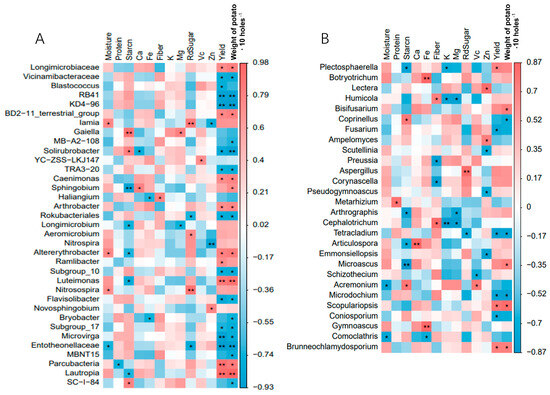 The correlation heatmaps between the crucial bacterial or fungal communities at the genus level and potato quality, yield, or weight using Spearman correlation coefficient analysis. (A) The associated heatmap between the soil bacterial genera and potato quality, yield, or weight. (B) The correlated heatmap between the soil fungal genera and potato quality, yield, or weight. Red indicates a positive correlation, and blue indicates a negative correlation. The darker the color, the higher the correlation. *: 0.01< p < 0.05; **: p < 0.01.