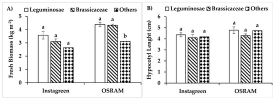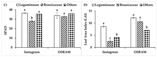 Mean (n = 3) of (A) fresh biomass (kg m−2), (B) hypocotyl length (cm), (C) SPAD content, and (D) leaf area index (LAI) for three family groups, i.e., leguminosae, brassicaaceae, and others, under two light recipes separately, INSTAGREEN and OSRAM LED. Error bars show the mean standard error. At the 5% probability level, small letters indicate a significant difference among the means for OSRAM and INSTAGREEN LEDs separately, where different letters show significant differences among the means.