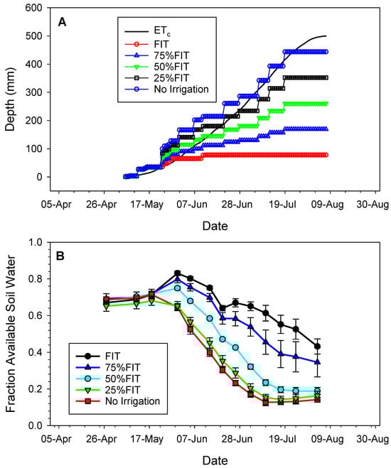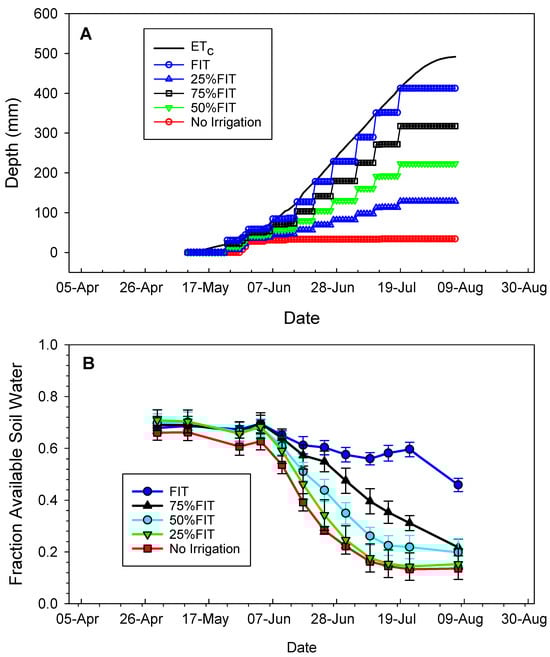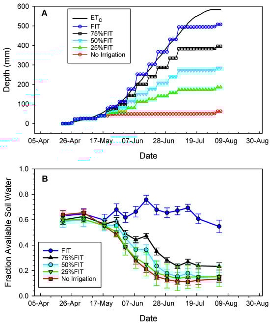 Study year 2022 (A) estimated malt barley evapotranspiration (ETc) and cumulative water (rainfall + irrigation) applied; (B) fraction of available water in each irrigation treatment (full irrigation (FIT), 75% FIT, 50% FIT, 25% FIT, and no irrigation). Bars represent the standard error of the measurements.