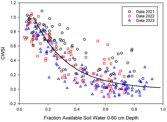 Relationship between daily crop water stress index (CWSI) and fraction of available soil water in the 0 to 0.6 m soil profile for the three study years combined (n = 294).