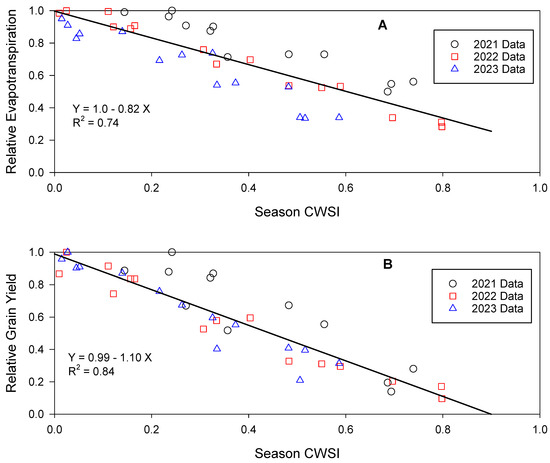The relationship between season CWSI and relative ETc is shown in Figure 5A. Relative ETc was calculated as the ratio of soil water balance-based ETc for each treatment replicate to the maximum ETc of any treatment replicate in a given study year. This relationship was well represented by a negative linear correlation, with a coefficient of determination of 0.74. Several data points in Figure 5A plot above the regression line, and these correspond to the 2021 study year. This is likely due to measured canopy temperatures being greater in 2021 compared to 2022 and 2023, potentially caused by bare ground visibility for the canopy temperature sensors resulting from crop emergence issues in some plots that year.