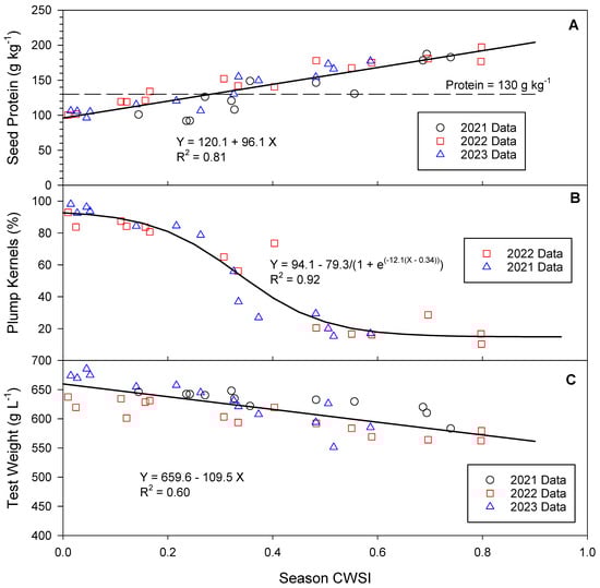 Relationship between season crop water stress index (CWSI) and (A) malt barley seed protein for the three study years combined; (B) percent plump kernels for study years 2022 and 2023 only; (C) seed test weight for the three study years combined.