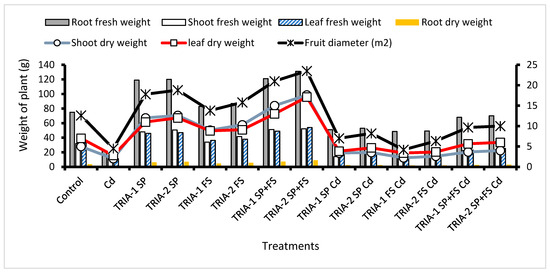 Compared with the control, Cd caused a considerable decline in the growth of the plants. Cd caused a reduction in shoot length (47%), root length (35%), number of leaves (40%), and leaf area (40.7%). TRIA 2-SP+FS mitigated the effects of Cd more effectively than SP and FS. TRIA 2-SP+FS and TRIA 1-SP+FS alleviated the toxic effects of Cd and improved the shoot length by 12.7% and 15.03% compared with Cd alone.
