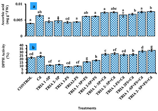 Effects of triacontanol on DPPH scavenging activity (a) and ascorbic acid content (b) of turnip plants under Cd stress. Data demonstrate means ± SE of 3 replicates. Significant differences between the treatments indicated by non-identical letters following values at p ≤ 0.05. Cd = 50 mg/kg Cd, TRIA 1-SP = 10 ppm Tria seed priming, TRIA 2-SP = 20 ppm Tria seed priming, TRIA 1-FS = 10 ppm Tria foliar spray, TRIA 2-FS = 20 ppm Tria foliar spray, TRIA 1-SP+FS = 10 ppm Tria seed priming + foliar spray, TRIA 2-SP+FS = 20 ppm Tria seed priming + foliar spray.