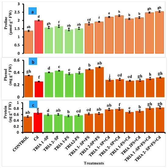 Cd caused a substantial reduction in the chlorophyll content. The reduction in chlorophyll a was 68%, in chlorophyll b was 48%, in total chlorophyll was 49%, and in carotenoids was 43%. TRIA 2-SP+FS+Cd resulted in the lowest reduction in chlorophyll a (9%), chlorophyll b (5% and 6%), total chlorophyll (3% and 6%), and carotenoids (12% and 13%), followed by TRIA 1-SP+Fs+Cd (13%, 6%, 6%, and 13%, respectively), compared with those under stress alone. Compared with the TRIA 2FS+Cd treatment, the Tria 1-FS+Cd treatment resulted in greater reductions in chlorophyll a (28%), chlorophyll b (29%), total chlorophyll (27%), and carotenoids (27%) than did the TRIA 2FS+Cd treatment (21%, 24%, 22%, and 33%, respectively). TRIA 2-SP+Cd resulted in considerable reductions in chlorophyll a (12%), chlorophyll b (15%), total chlorophyll (13%), and carotenoids (16%) compared with TRIA 1-SP+Cd (15%, 18%, 13%, and 16%, respectively), followed by stress alone.