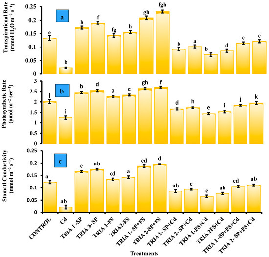 Cd toxicity caused a greater decline in the transpiration rate (82%), photosynthetic rate (37%) and stomatal conductance (81%). Compared with Cd alone, Tria in combination with Cd had positive results. The minimum reduction was observed in the TRIA 2-SP+FS+Cd plants, and the transpiration rate, photosynthetic rate, and stomatal conductance were 9%, 14%, and 30%, lower than those in the TRIA 1-SP+FS+Cd plants, which were 14%, 8%, and 14%, respectively, relative to the Cd-only plants. TRIA-1-SP+Cd resulted in greater reductions in the transpiration rate, photosynthetic rate, and stomatal conductance (31%, 17%, and 30%, respectively) than TRIA-1-SP+Cd (23%, 14%, and 30%, respectively). TRIA 2-FS+Cd resulted in a minimum reduction in the transpiration rate, photosynthetic rate, and stomatal conductance (35%, 24%, and 37%, respectively), followed by TRIA 1-FS+Cd (45%, 28%, and 41%, respectively), compared with those under Cd stress alone.