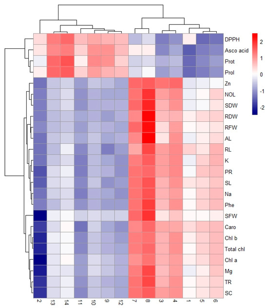 Heatmap histogram correlation among various morpho-physiological parameters Tria treated turnip plants grown under Cd toxicity. Shoot length (SL), root length (RL), no. of leaves (NOL), area of leaf (Al), root dry weight (RDW), shoot dry weight (SDW), root fresh weight (RFW), chlorophyll a (Chl a), chlorophyll b (Chl b), total chlorophyll (Total chl), carotenoid (Caro), magnesium (Mg), zinc (Zn), potassium (K), sodium (Na), protein (Prot), proline (Prol), phenol (Phe), ascorbic acid (Asco acid), transpiration rate (TR), photosynthetic rate (PR), stomatal conductance (SC).