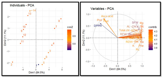 Loading plots of principal component analysis (Dim1: 84.5%; Dim2: 11.1%) among various morpho-physiological parameters of Tria-treated turnip plants grown under Cd toxicity. Shoot length (SL), root length (RL), no. of leaves (NOL), area of leaf (Al), root dry weight (RDW), shoot dry weight (SDW), root fresh weight (RFW), chlorophyll a (Chl a), chlorophyll b (Chl b), total chlorophyll (Total chl), carotenoid (Caro), magnesium (Mg), zinc (Zn), potassium (K), sodium (Na), protein (Prot), proline (Prol), phenol (Phe), ascorbic acid (Asco acid), transpiration rate (TR), photosynthetic rate (PR), stomatal conductance (SC).