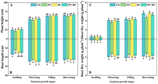 Compared to CK, PE treatment significantly reduced soybean plant height across four stages by 3.5 to 14.4% (Figure 1A). Compared to PE treatment alone, the PE+BC treatment increased soybean shoot height by 3.5 to 21.6% (Figure 1A). There were no significant differences in root length between treatments at the flowering and harvesting stages. Under PE treatment, soybean root length at the seedling stage was significantly lower than in CK, while at the grain-filling stage, it was lower than in the PE+BC treatment, by 2.5% (Figure 1B).