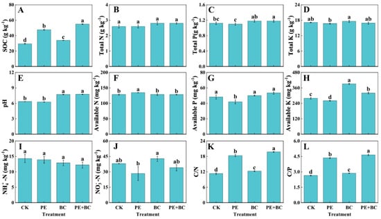 The PE (47.7 g kg−1) significantly increased SOC accumulation relative to CK, particularly in the PE+BC treatment (55.0 g kg−1), with increases of 61.5 and 86.3%, respectively (Figure 2A). Meanwhile, the PE and PE+BC treatments significantly increased the soil C to N or P ratio compared to CK (Figure 2K,L). PE treatment alone led to a significant increase in soil AN (134.7 mg kg−1) content, while no significant differences were found among other treatments (Figure 2F). However, TN and NH4+-N contents were not significantly different among the treatments, ranging from 2.6 to 2.8 g kg−1 and 12.22 to 14.32 g kg−1 (Figure 2B,I). As for soil P and K nutrients, PE treatment significantly reduced AP (41.9 mg kg−1) and TP (1.1g kg−1) contents compared with CK. Compared with PE+BC treatments, PE treatment reduced soil TP content by 19.7 and 7.3%, TN (2.6 g kg−1) content by 6.9%, AP content by 27.4%, AK (259.67 mg kg−1) content by 54.2%, and NO3−-N (28.33 mg kg−1) content by 20.1% (Figure 2C,D,G,H,J). Soil pH consistently increased by 23.8 and 23.1% in the BC and PE+BC treatments compared with CK (Figure 2E).